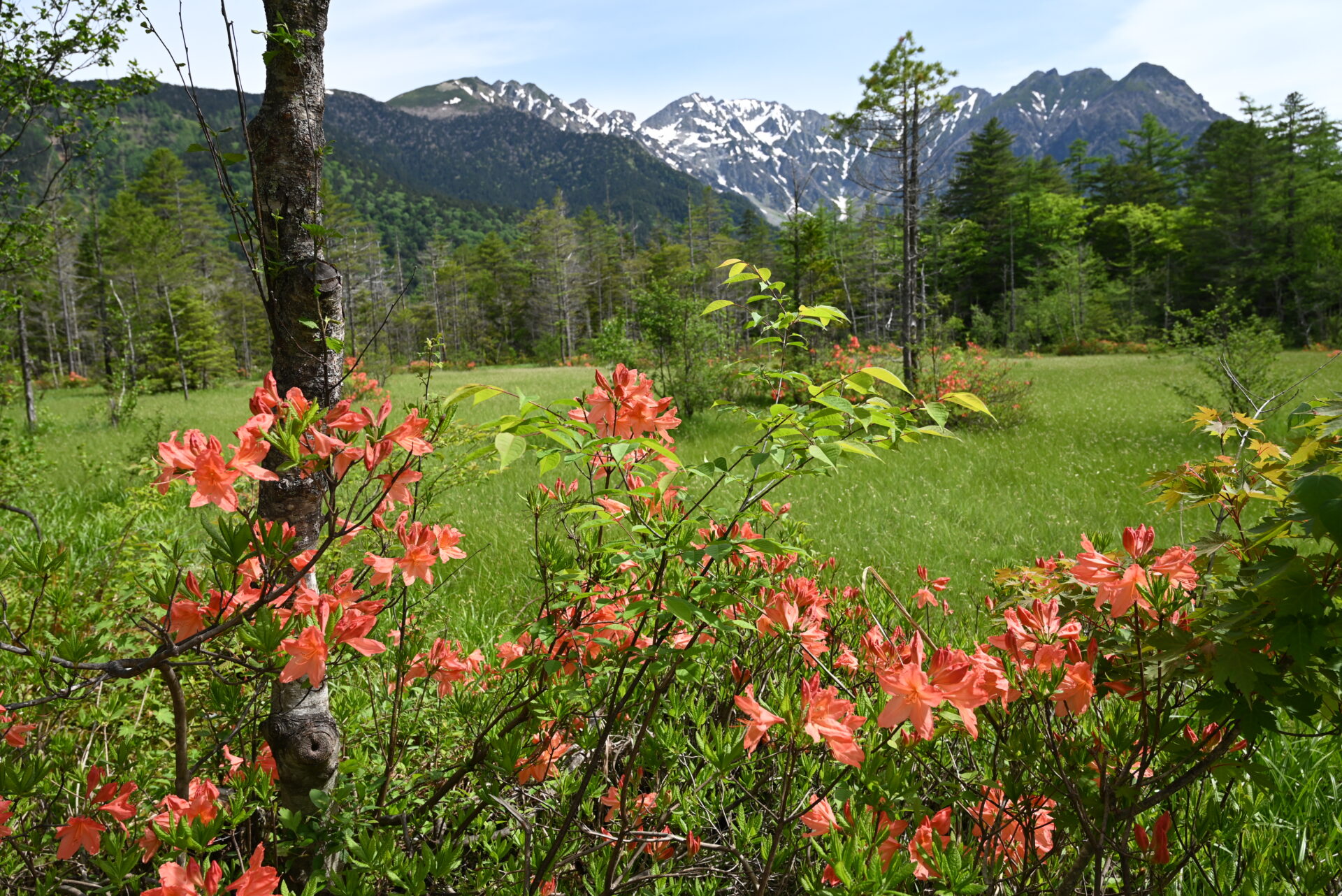 上高地の6月・穂高連峰と田代湿原のレンゲツツジ