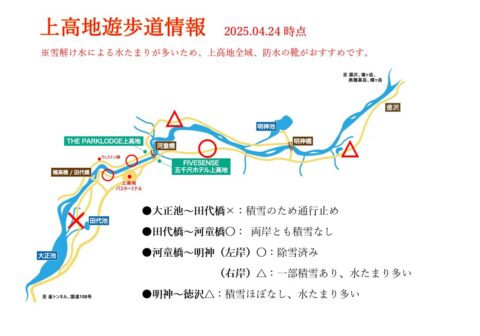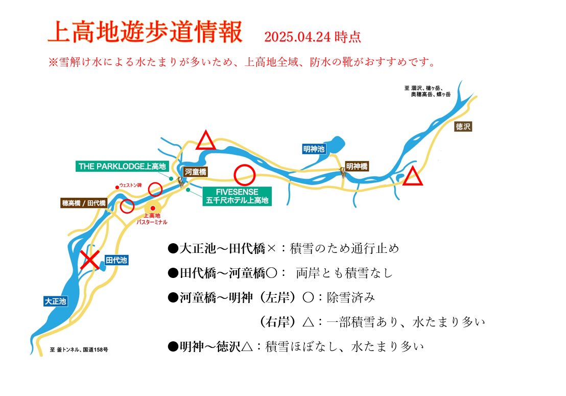 上高地遊歩道状況2025.04.24 FIVESENSE2025-04-24T16:04:31+09:002025-04-24| Share FacebookXRedditLinkedInWhatsAppTumblrPinterestVkXing電子メール